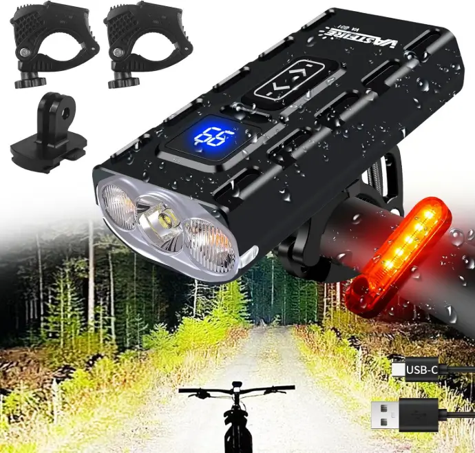 These VASTFIRE bike lights provide powerful front and rear illumination so you can ride safely and clearly see the road at night. The aluminum mounts keep the lights secure even on rough terrain, while the waterproof design ensures dependable performance in rain. Both lights are USB-C rechargeable, giving you fast and convenient charging for daily commuting or long-distance rides. With a durable metal headlight and bright rear warning light, this set is perfect for ebikes, mountain bikes, and city cycling